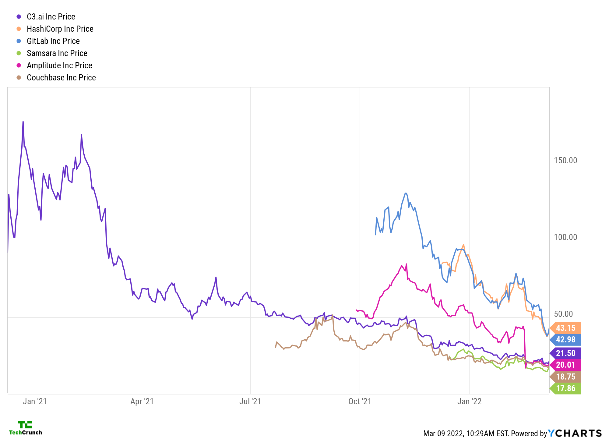 Here’s a chart of C3.ai’s share price performance since launch, with Hashicorp, GitLab, Samsara, Amplitude and Couchbase in the mix as well, joining the chart when they went public (data via YCharts):