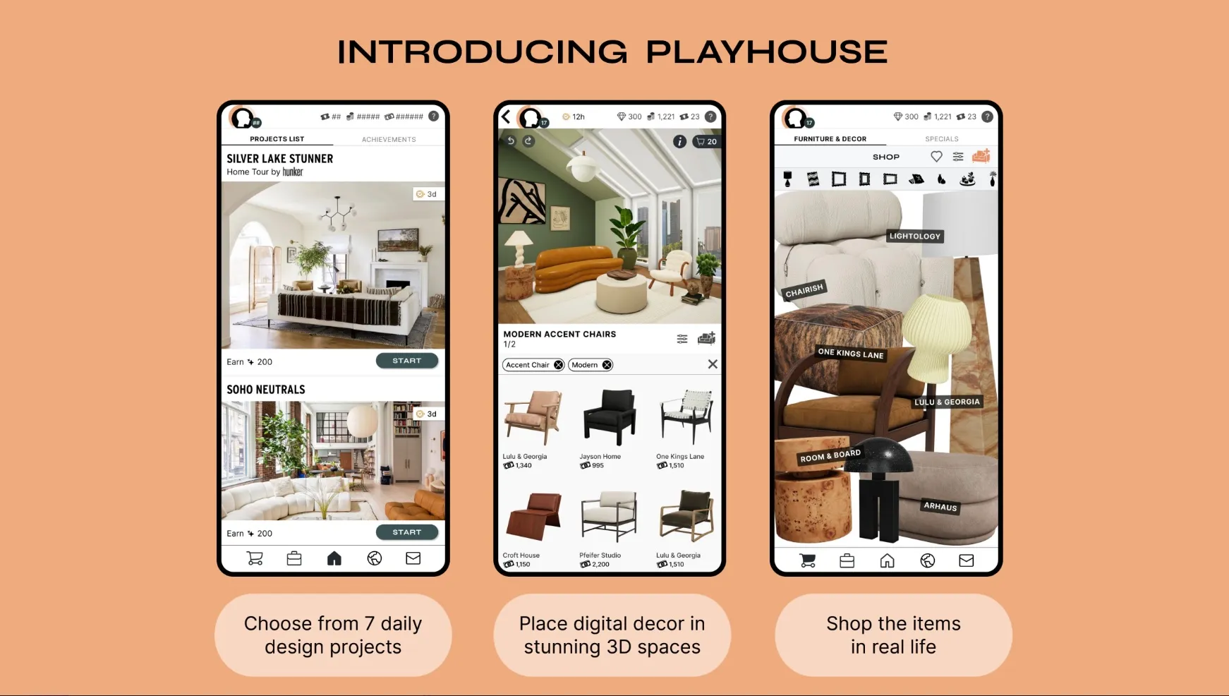 At launch, PLAYHOUSE features shoppable experiences that connect players to brands like Arhaus, Article, 1stDibs, Chairish, One Kings Lane, ABC Carpet & Home, Jenni Kayne, Society6, Bloomscape, Room & Board and Lulu & Georgia, among others. In other words, the game’s goal isn’t just to provide a creative outlet for art and interior design fans but to also drive the discovery of new furniture and decor.