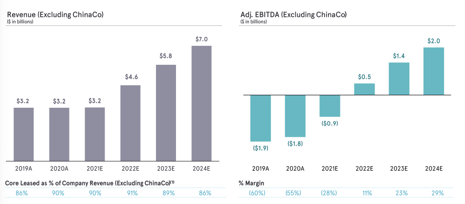 In 2021, WeWork ended the year with revenues of $2.57 billion, adjusted EBITDA losses of $1.53 billion, and net loss of $4.63 billion. Comparing those figures with what we saw in its SPAC deck, there’s an incredibly massive divergence.