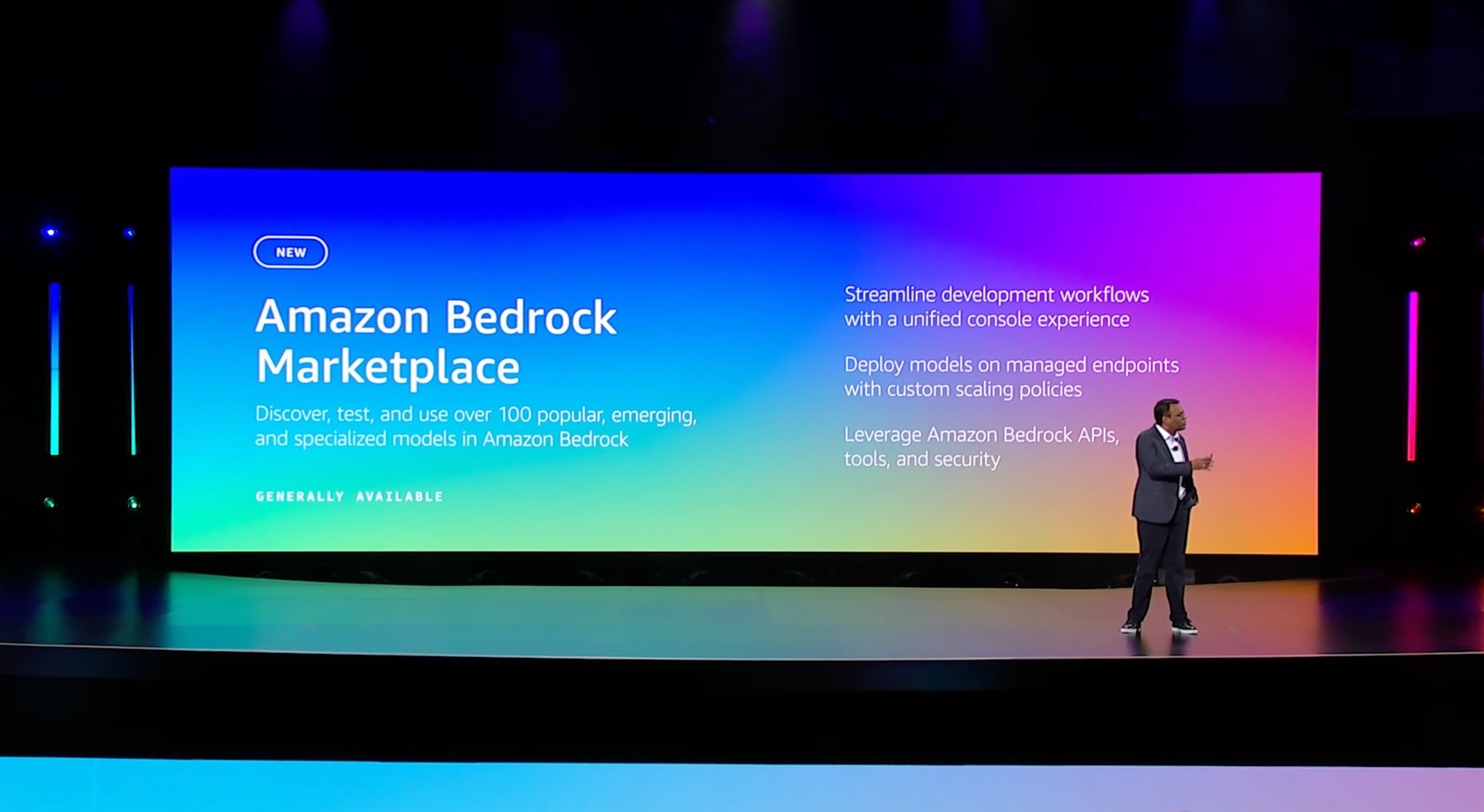 Lastly, AWS is also launching a new marketplace for Bedrock. The idea here, Deo said, is that while Amazon is partnering with many of the larger model providers, there are now hundreds of specialized models that may only have a few dedicated users. Since those customers are asking the company to support these, AWS is launching a marketplace for these models, where the only major difference is that users will have to provision and manage the capacity of their infrastructure themselves — something that Bedrock typically handles automatically. In total, AWS will offer about 100 of these emerging and specialized models, with more to come.